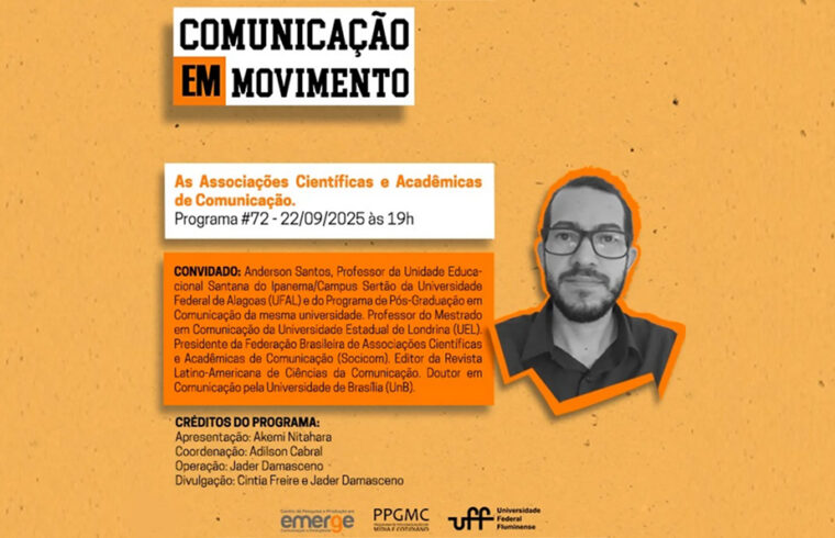 A edição 72 do programa Comunicação em Movimento (CEM #72) receberá nesta segunda-feira (22), às 19h, o presidente da SOCICOM, professor Anderson Santos (Ufal), para uma conversa sobre “As Associações Científicas e Acadêmicas de Comunicação”. A transmissão será no canal do YouTube @EmergeUFF.